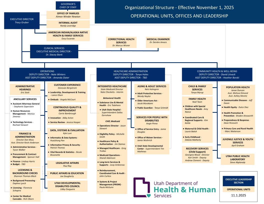 Nate Winters was appointed deputy director of DHHS over operations with the merger of the Department of Health and the Department of Human Services in July 2022. Prior to that he assisted with the merger of the two departments as an assistant deputy director. He was recently assistant division director for the Utah Department of Human Services (DHS) Division of Juvenile Justice Services with a primary focus in finance, budget, and operations. Previously, Nate held roles as director of finance, compensation, and benefits for the Utah Department of Human Resource Management, and budget director for DHS. Nate holds a Bachelor’s degree in Economics and a Master’s degree in Business Administration (MBA).